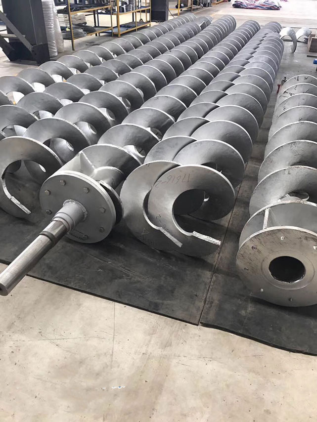 無軸螺旋輸送機與傳統(tǒng)有軸螺旋輸送機相比,由于采用了無中心軸設(shè)計,利用具有一定柔性的整體鋼制螺旋推送物料,因而具有以下突出優(yōu)點:抗纏繞性強。無中心軸干擾,對于輸送帶狀、易纏繞物料有特殊的優(yōu)越性。無軸螺旋輸送機用途: XDH型系列無軸螺旋輸送機用于污水處理廠輸送中細格柵其柵條凈距50mm的除污機柵渣和壓濾機泥餅等物料。 環(huán)保性能好。采用全封閉輸送和易清洗的螺旋表面,可保證環(huán)境衛(wèi)生和所送物料不受污染、不泄漏。 扭距大、能耗低。由于螺旋無軸,物料不易堵塞,排料口不堵塞,因而可以較低速度運轉(zhuǎn),平穩(wěn)傳動,降低能耗。扭距可達4000N/m。輸送量大。輸送量是相同直徑傳統(tǒng)有軸螺旋輸送機的1.5倍。輸送距離長。單機輸送長度可達60米。并可根據(jù)用戶需要,采用多級串聯(lián)式安裝,超長距離輸送物料。能機動工作。我公司開發(fā)生產(chǎn)的移動型無軸螺旋輸送機,能機動工作,一機多用。既可下方出料,又可端頭出料。采用特制襯板,該機可在高溫下工作。結(jié)構(gòu)緊湊,節(jié)省空間,外型美觀,操作簡便,經(jīng)濟耐用。